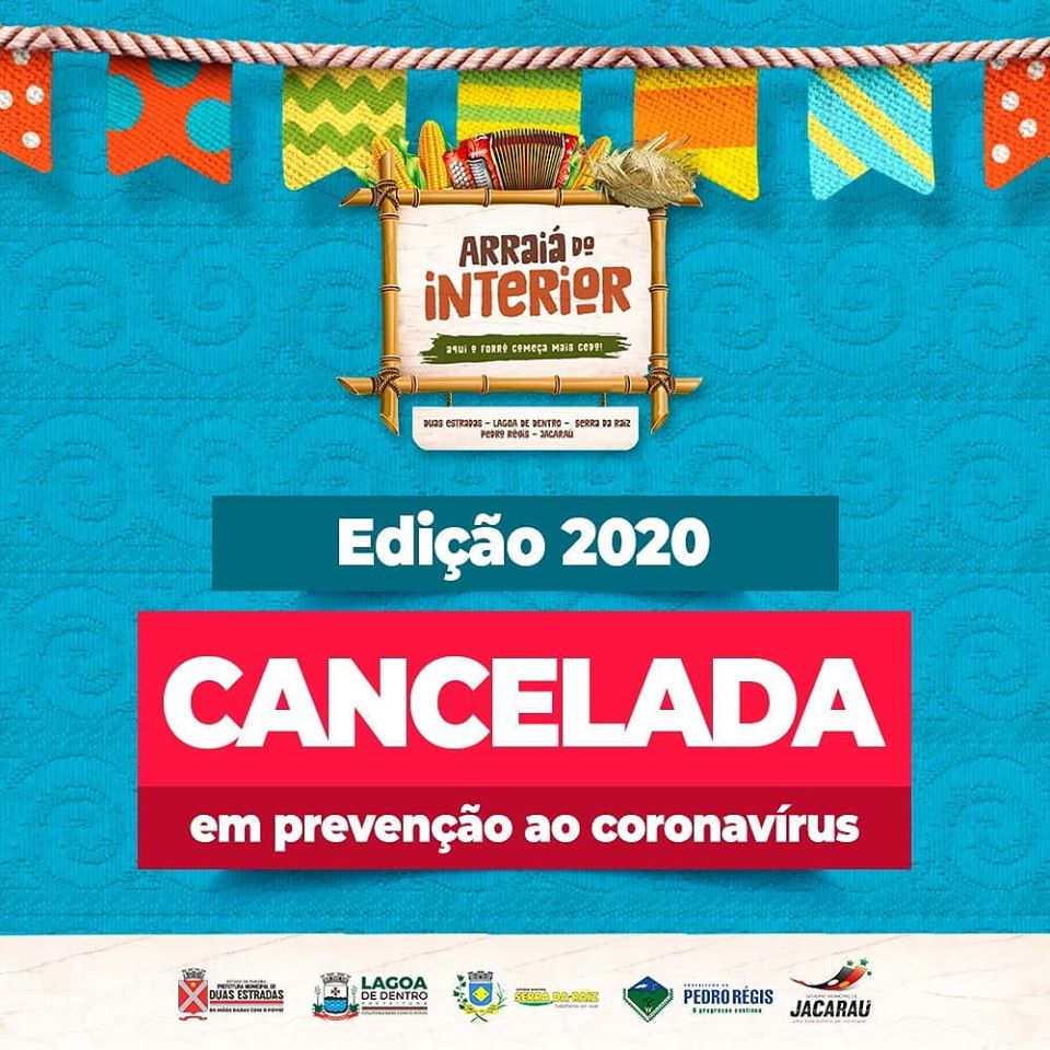 As cinco prefeituras que compõem o Arraiá do Interior decidiram de forma conjunta cancelar a edição 2020 do evento, a decisão se dar pela crise mundial em saúde devido ao Coronavírus que exige ações efetivas de combate ao mesmo.