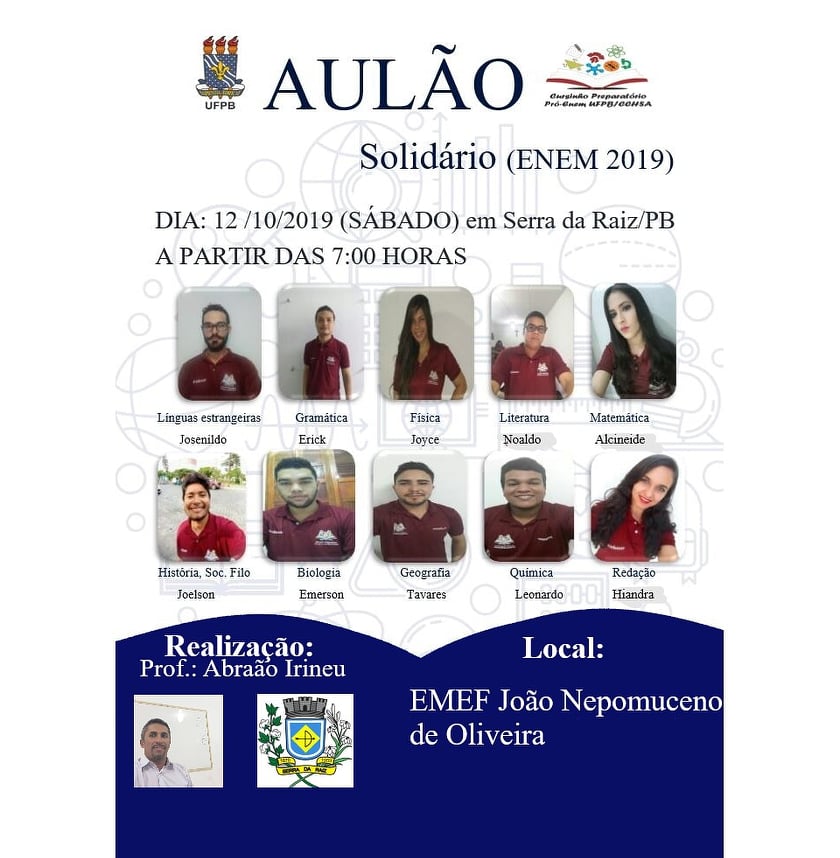 A gestão municipal através da secretaria de educação realizará dia 12 de outubro um aulão solidário para o Enem 2019.