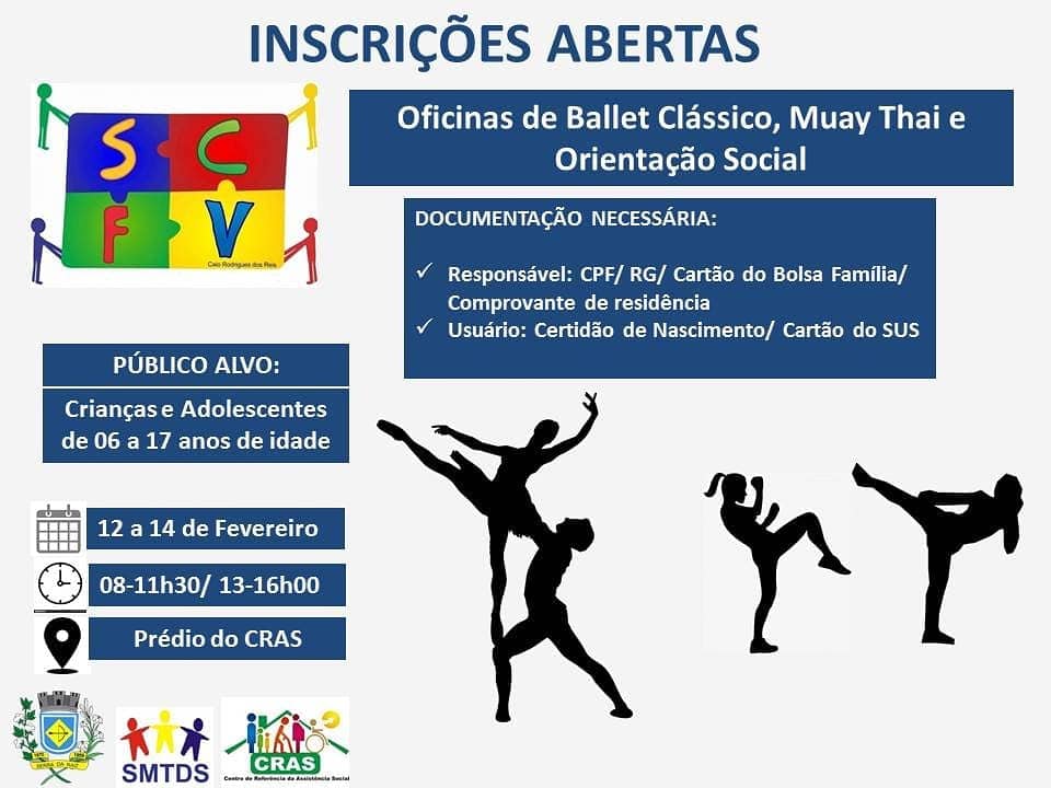 Quem tem entre 06 e 17 anos pode participar, serão ofertadas oficinas de Ballet Classíco, Muay Thay e Orientação Social. Inscrições validas até dia 14/02 no prédio do CRAS das 08 as 11:30min e de 13 as 16hrs.