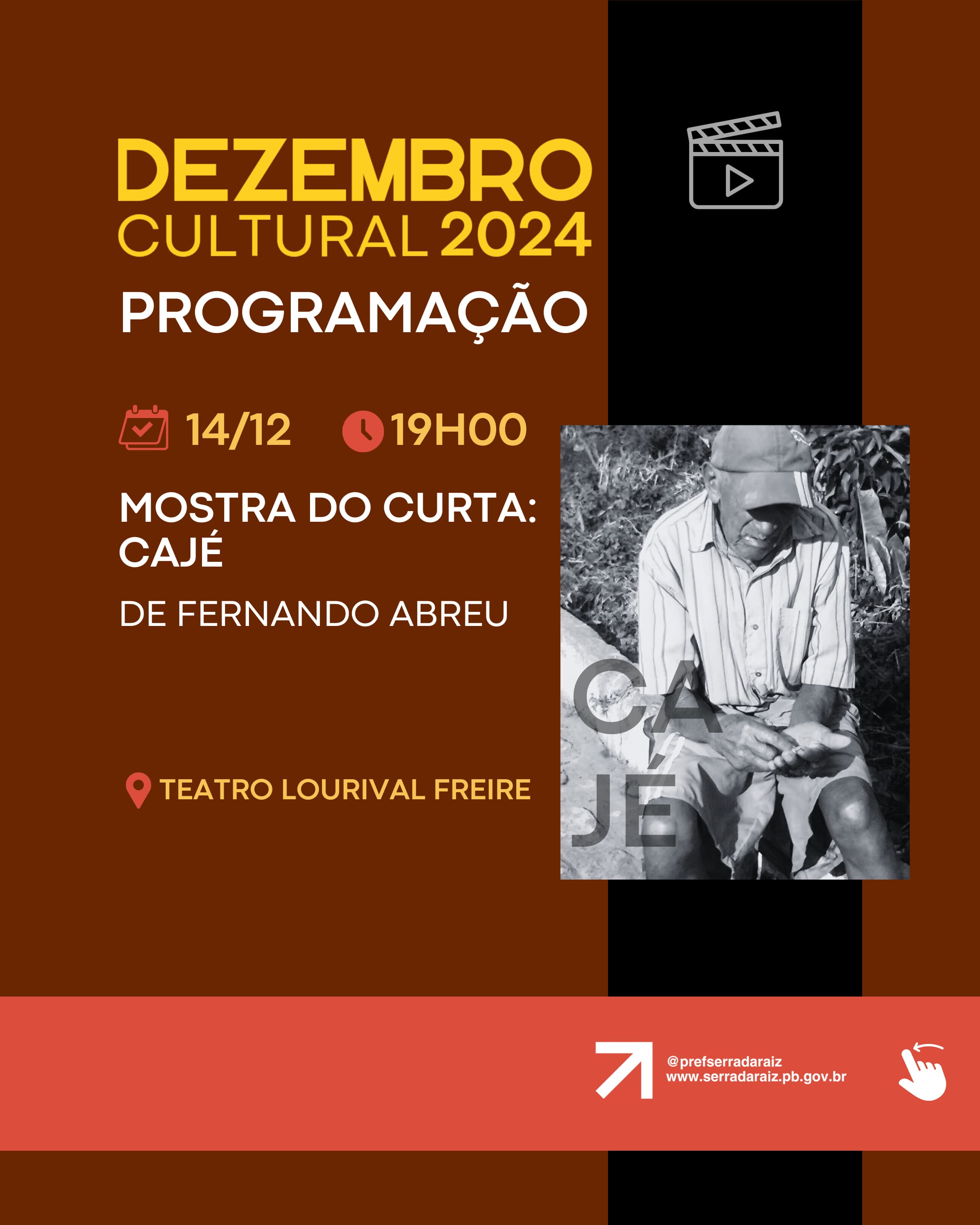 Às 19h, no Teatro Lourival Freire, teremos a exibição de dois curtas metragens: Mestre Adauto - o som que entoa nossa Serra de Rafael Melo e Cajé de Fernando Abreu.