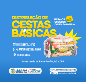 A gestão municipal através da Secretaria do Trabalho e Desenvolvimento Social estará entregando cesta básicas as famílias beneficiárias do Bolsa família nesta sexta-feira (24).