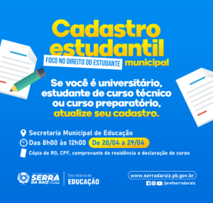 A gestão municipal através da secretaria de educação está dando início ao cadastro dos estudantes universitários e de cursos fora do município que precisam de transporte.