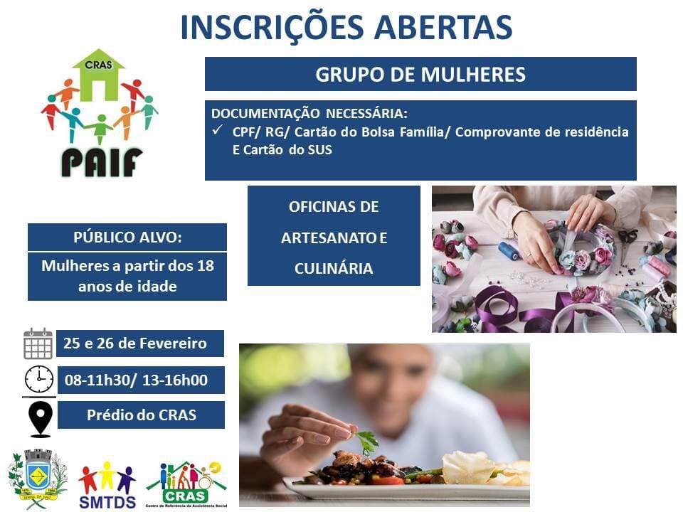 O grupo de mulheres é voltada as mesmas a partir dos 18 anos e na hora da inscrição levar CPF, RG, comprovante de residencia, cartão do Bolsa Família e cartão do SUS.