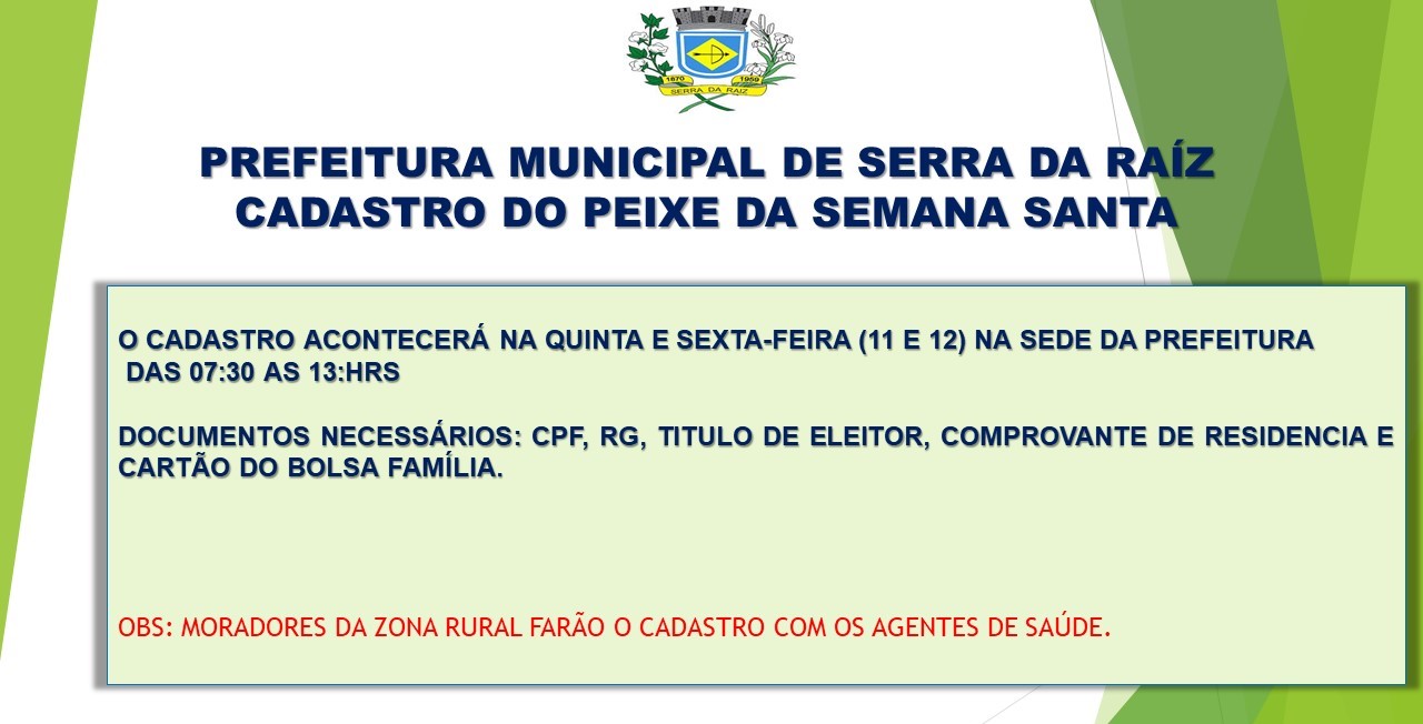 A gestão municipal estará na quinta e sexta-feira (11 e 12) realizando o cadastro para distribuição do peixe na Semana Santa, mais um ano que a prefeitura cumpre com esta ação social.
