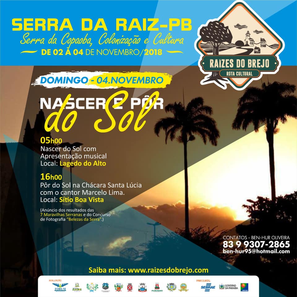 O Raízes do Brejo-Rota Cultural que teve início na última sexta-feira, 02 de novembro, em Serra da Raiz, se encerra neste domingo (04) com uma vasta programação, que começa com o nascer do sol no Lajedo do Alto, a partir das 05h00, com música ao vivo.
