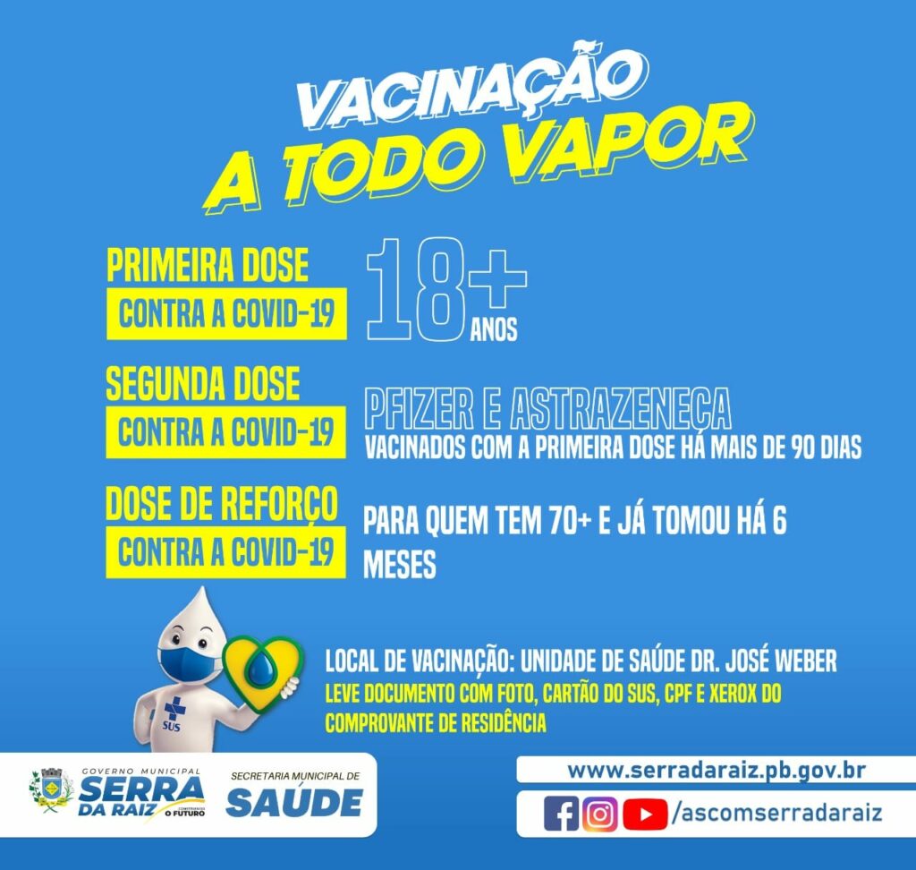 Informamos que na tarde da quinta-feira (16), iniciamos a vacinação da DOSE DE REFORÇO da população idosa acima de 70 anos que já completaram 6 meses da última dose. Recomendação feita pelo Ministério da Saúde.