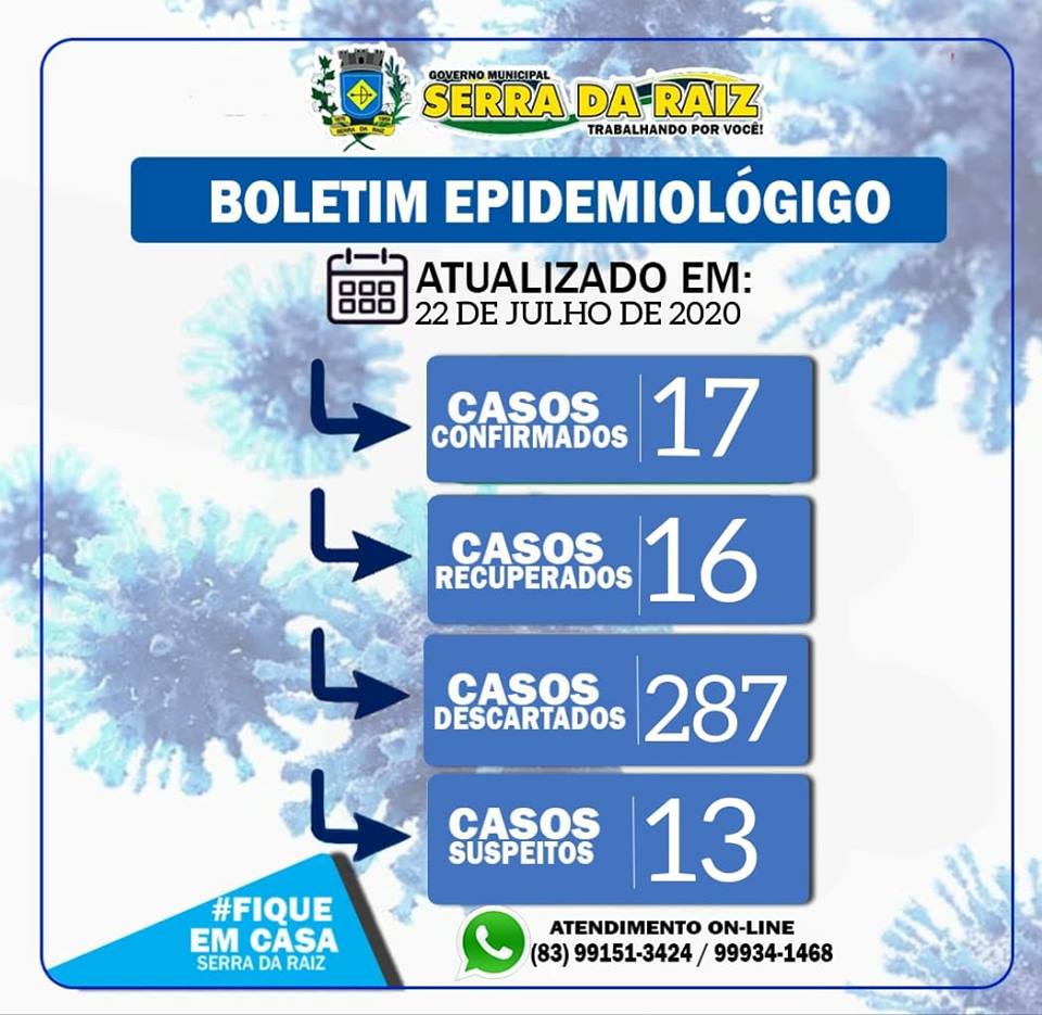 Foram realizados nesta terca feira, 21/07, mais 22 Testes Rapidos para COVID-19, 20 resultados NAO REAGENTES (descartados) e 2 casos novos , porém já CURADOS, com Anticorpos IGG, ambos estavam há 20 dias em João Pessoa.