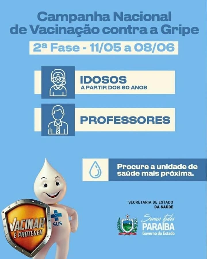A partir de hoje começa a 2° fase da campanha da influenza idosos e professores porém, iremos vacinar primeiros os idosos, depois os professores