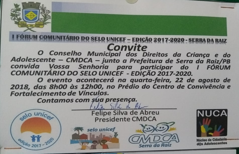 O presidente do Conselho Municipal dos Direitos da Criança e do Adolescente (CMDCA) Felipe Silva, juntamente com a gestão municipal, convidam toda a comunidade a participarem do 1º Fórum Comunitário do Selo Unicef município aprovado 2017/2020.