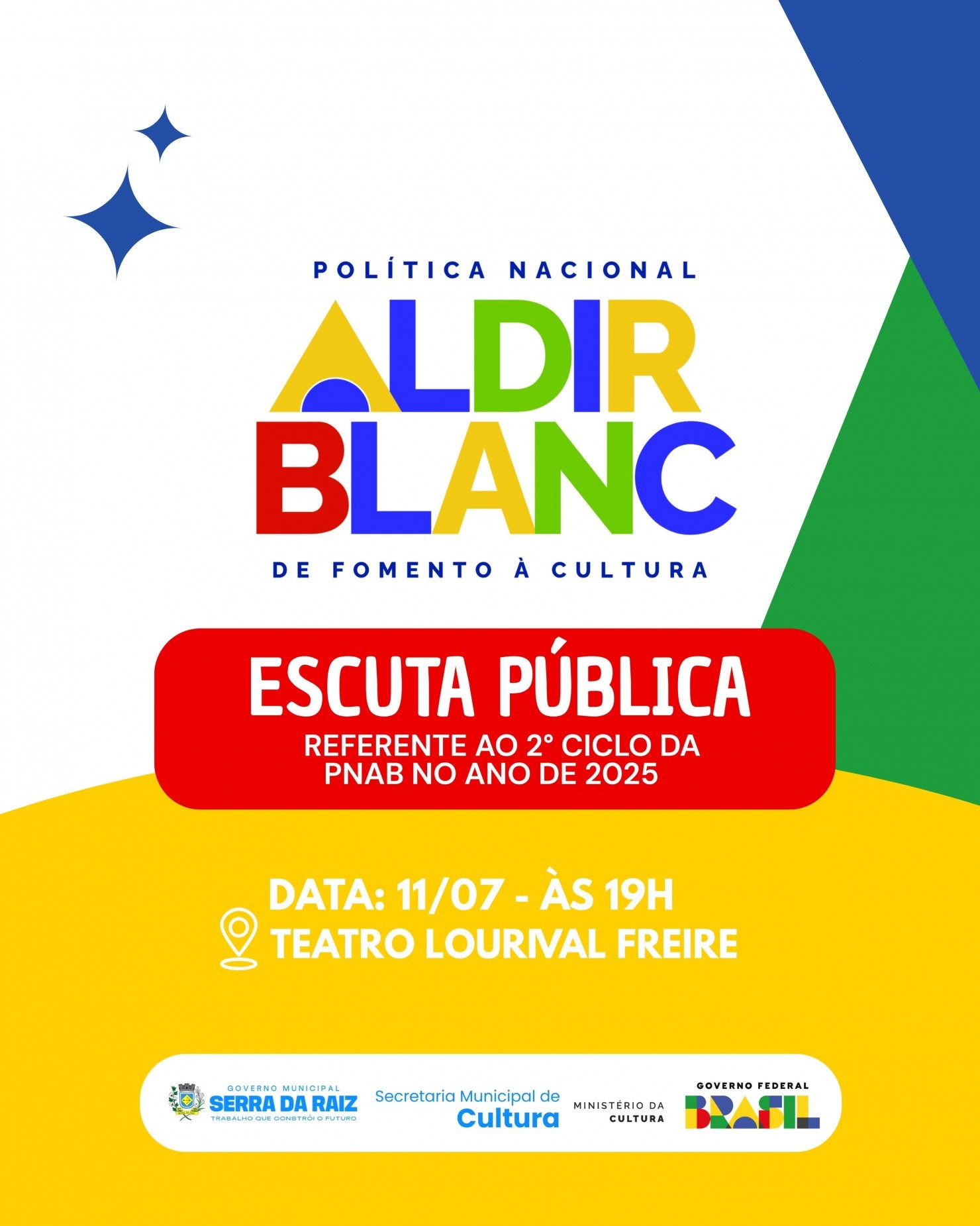 A Cultura é feita com participação popular, por isso a gestão por meio da secretaria de cultura realizará Escuta Pública referente ao 2º Ciclo da Política Nacional Aldir Blanc – PNAB 2025