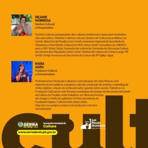 A reunião contará com as presenças de Rejane Nóbrega, gestora cultural e pesquisadora e Raisa Agra, produtora cultural e comunicadora. Devem participar artistas e trabalhadores da cultura em todo o município.