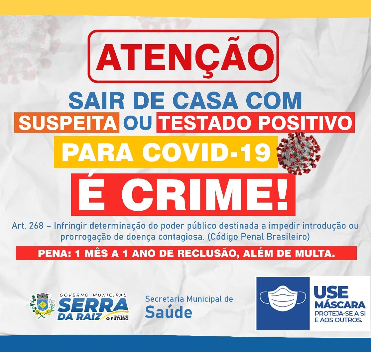 Qualquer pessoa suspeita ou positivada para Covid-19 que quebre o isolamento e circula em meio a outras pessoas está sujeita a prisão.