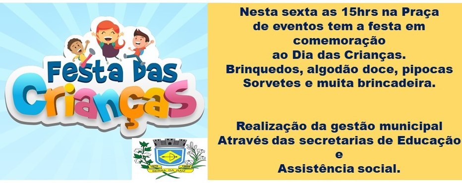 A Prefeitura Municipal através da secretaria de educação e da secretaria do Trabalho e Desenvolvimento Social, realizará na sexta-feira (11) a festa em comemoração ao dia da criança.