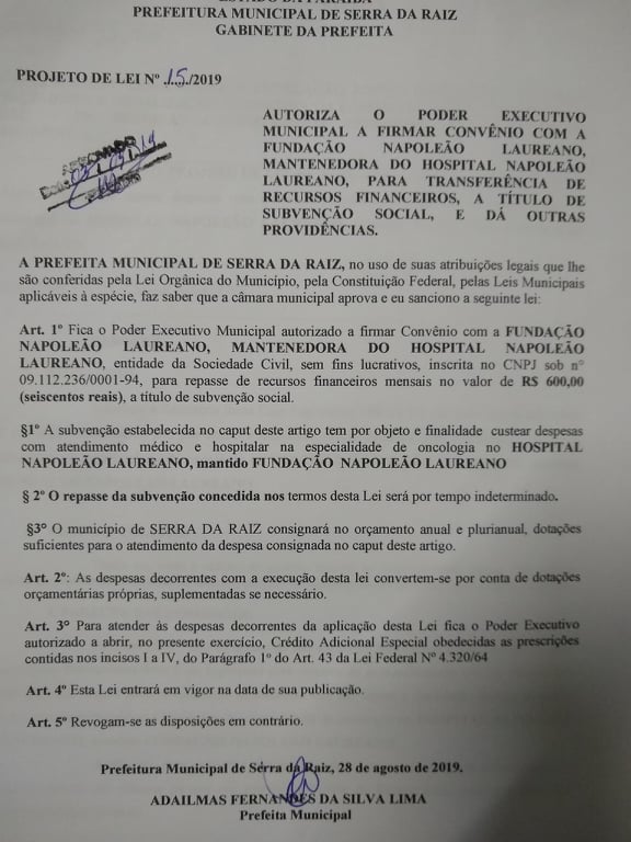 A prefeita Adailma Fernandes encaminhou ao legislativo municipal e foi aprovado um projeto de lei pedindo autorização para doação mensal a Fundação Napoleão Laureano a qual mantém o Hospital Napoleão Laureano que cuida de pessoas com câncer.