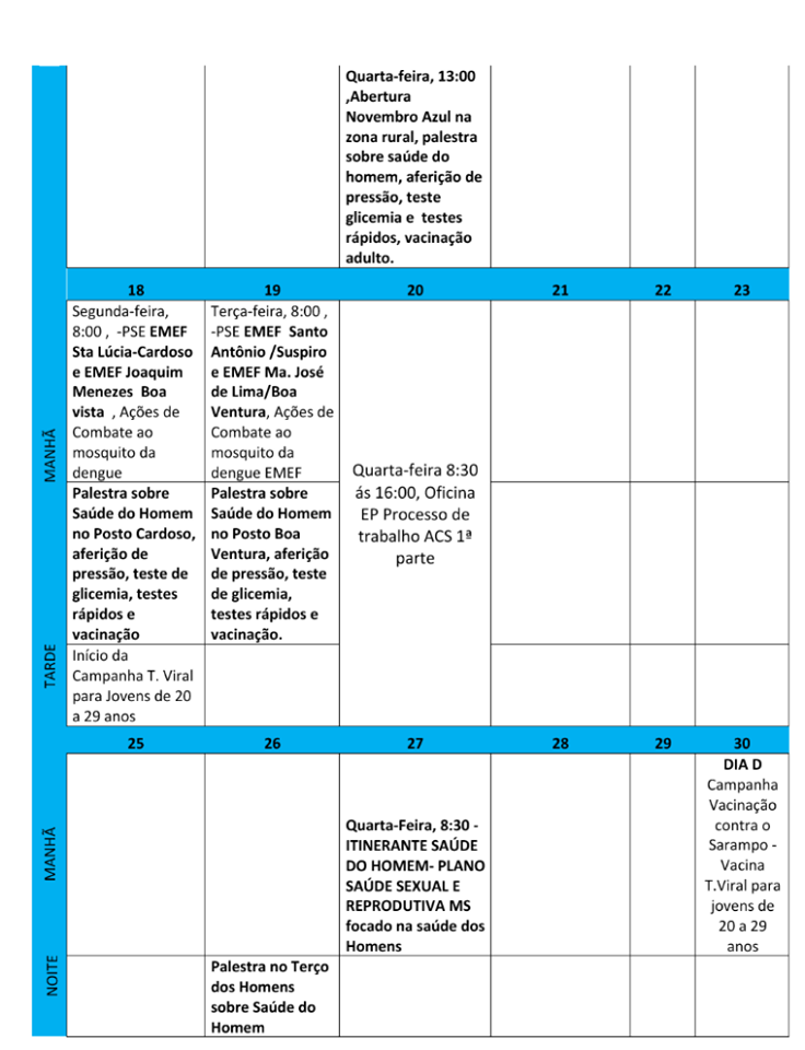 A Secretaria Municipal de Saúde de Serra da Raiz participa da campanha “Novembro Azul”. As Unidades Básicas de Saúde (UBSs) irão realizar uma série de atividades, abordando temas como Doenças Crônicas Não Transmissíveis-DCNT(hipertensão, diabetes, transtorno mental e neoplasias), alimentação saudável, Saúde Bucal, atividade física, vacinação, Infecções Sexualmente Transmissíveis (ISTs) e paternidade responsável.