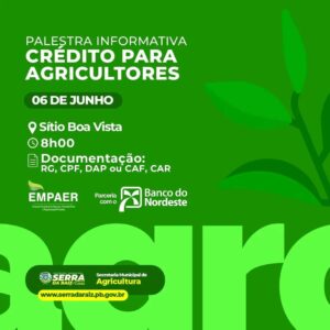 A gestão municipal através da Secretaria de Agricultura, realiza nesta terça-feira (06) uma palestra informativa sobre crédito para trabalhadores rurais.