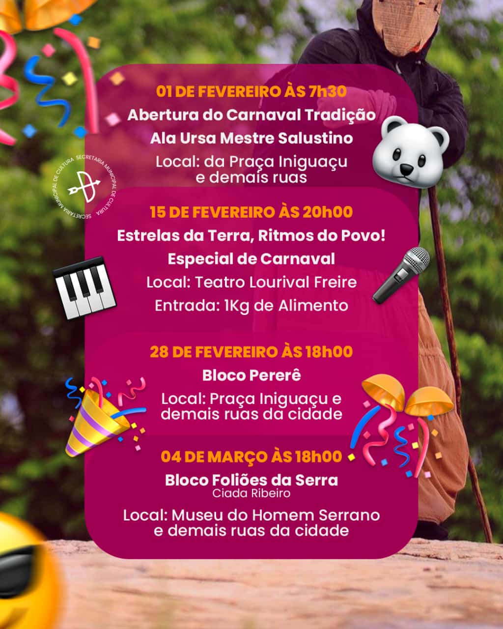 A gestão municipal por meio das secretarias de cultura e turismo lançou a programação oficial do carnaval tradição que terá início neste sábado (01).