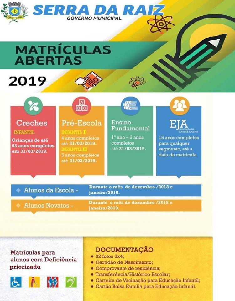 A prefeitura municipal através da secretaria de educação, deu inicio as matrículas para o ano letivo 2019.