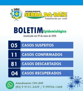 No novo boletim divulgado o município registra 11 casos de Coronavírus, destes, 04 estão recuperados e os demais estão se tratando em casa com acompanhamento da equipe de saúde.