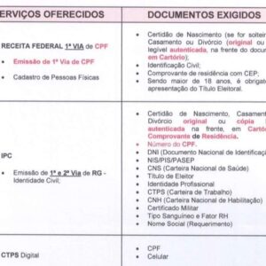 Serão emitidos documentos de RG, CPF e carteira de trabalho.