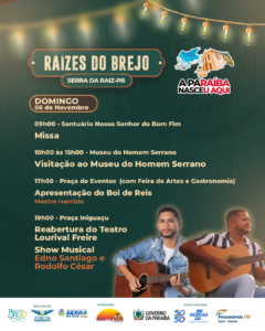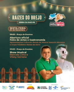A programação da Rota Cultural Raízes do Brejo chega a Serra da Raíz neste final de semana, o evento acontece nos dias 4, 5 e 6 de novembro.
