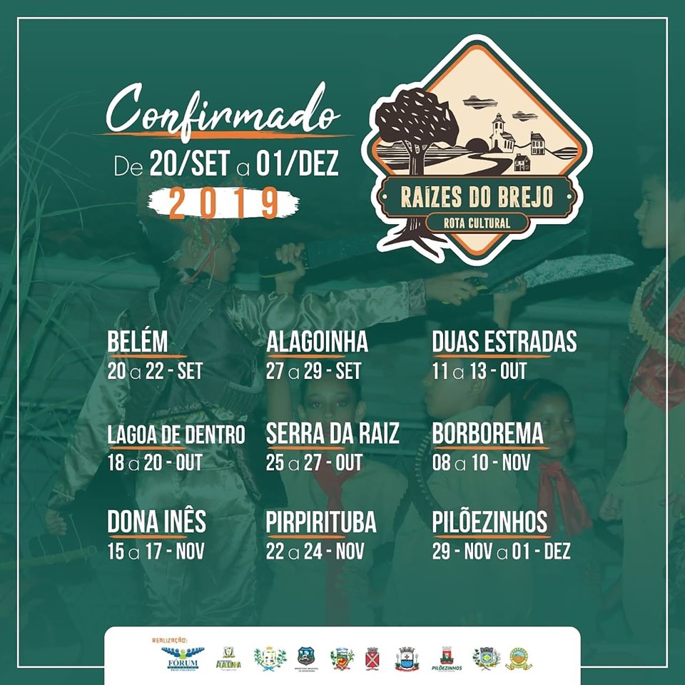 Começa dia 20 na cidade de Belém e vai até dia 01 de dezembro a Rota Cultural Raízes do Brejo 2019, no link abaixo você confere as datas e acompanha a programação https://brejoparaibano.com.br/raizes-do-brejo/