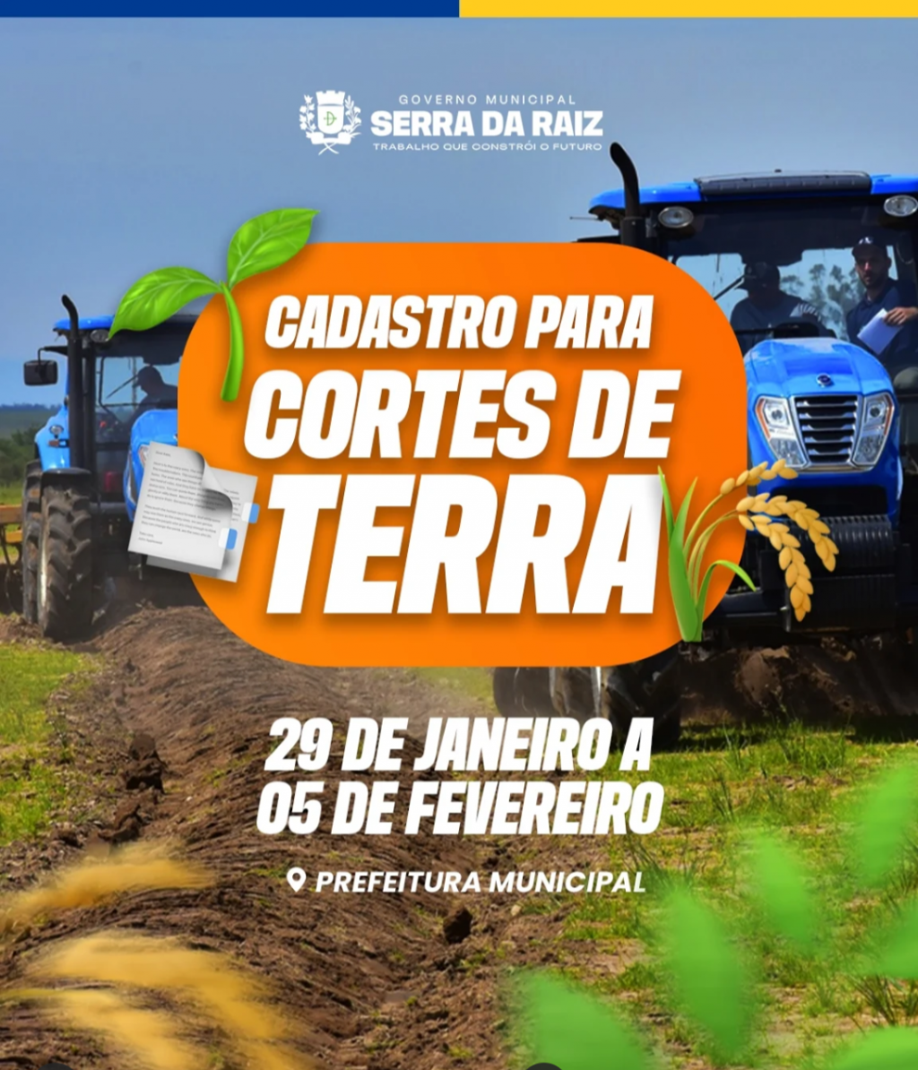 A Prefeitura de Serra da Raiz por meio da secretaria de agricultura informa que o cadastro para o programa de Corte de Terra estará aberto de 29 de janeiro a 05 de fevereiro, na sede da Prefeitura Municipal.