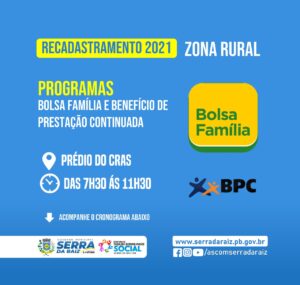 A Secretaria de Trabalho e Desenvolvimento Social através da Gestão Municipal do Programa Bolsa e Família e CadÚnico lembra a população a continuidade do calendário de recadastramento 2021, agora com as comunidades da Zona Rural do município.