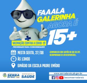 Continuando com a programação de vacinação contra COVID 19, chegamos aos adolescentes, faixa etária de 15 e +, prioridade para comorbidades, também 18 anos e+ que ainda não se vacinaram.