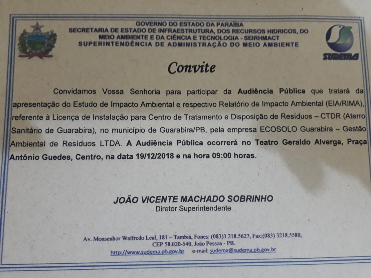 A Superintendência de Administração do Meio Ambiente (Sudema) realiza, nesta quarta-feira (19), às 9h, no Teatro Geraldo Alverga, em Guarabira, uma Audiência Pública para apresentação do Estudo de Impacto Ambiental e o Relatório de Impacto Ambiental (EIA/Rima) sobre a Licença de Instalação para o Centro de Tratamento e Disposição de Resíduos (Aterro Sanitário de Guarabira) de um conssórcio que agrega 25 municípios no Agreste paraibano.